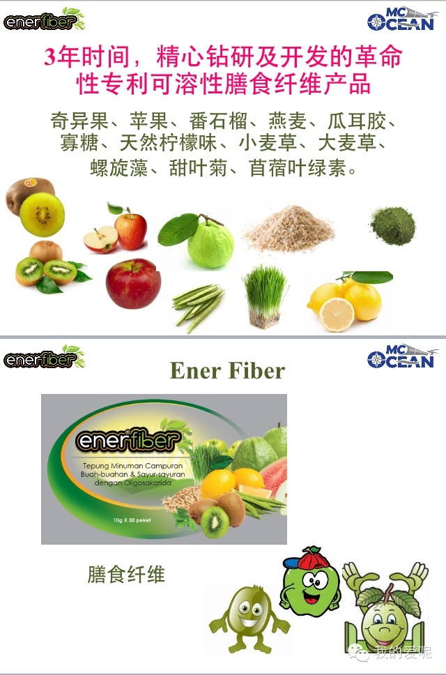 EnerFiber膳食纤维的原材料是100%天然蔬菜和谷类,奇异果、、番石榴、燕麦、瓜耳胶,寡糖、天然柠檬味、小麦草、大麦草、螺旋藻(Spirullina)、甜叶菊、苜宿叶绿素(Chlorophyll)。